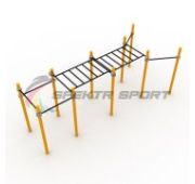 Комплекс состоит из: Десяти опорных столбов, изготовленных из металлических труб, сверху закрытых металлическими полусферами: 3,3 м. – 4 шт., 2,2 м. – 3 шт., 1,7 м. – 1 шт., 1,2 м. – 2 шт.. Двух перекладин для подтягивания – 1200 мм и и одной перекладины «молоток» для неклассического подтягивания. Перекладины для фиксации ног длиной 590 мм. Лавки, которая состоит из комплекта бруса сечением 80×80 мм, длиной 1600 мм и проставочных колец. Шведской стенки с расстоянием между перекладинами 356 мм. Брусьев, (две перекладины длиной 1800 мм). В комплект поставки входит 20 хомутов. Параметры упаковки: Вес: 272 кг. Объем: 0,65 м³. Характеристики: Высота установленных столбов: 2600 мм. Поставляется в 3-х вариантах: 76, 89 или 108 мм. Толщина стенок столбов: 3,5 мм. Диаметр перекладин: 33,5 мм. Длина перекладин: 1200 мм. Перекладины для фиксации ног: 590 мм. Шаг перекладин шведской стенки: 356 мм. Диаметр перекладин брусьев: 48 мм. Длина брусьев: 1800 мм. Фиксация: При помощи металлических хомутов, регулируемых по высоте. Покрытие: конструкция снаряда покрыта атмосферостойкой порошковой краской, нанесенной методом электростатического напыления с последующим обжигом в печи. Цвет конструкции: на выбор по каталогу RAL (уточнять наличие у менеджера). Габаритный размер комплекса в установленном виде, ДхШхВ, мм.: 2950х2850х2600.