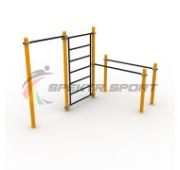Комплекс состоит из: Двенадцати опорных вертикальных столбов: 3,3 м - 8 шт., 2.2 м - 4 шт.; Одной горизонтальной перекладины длиной 1200 мм.; Двойного рукохода.; Двойных брусьев для отжиманий.; Шведская стенка.; 22 металлических хомута. Параметры упаковки: Вес, кг.: 388. Объём, м3.: 0.98. Основные технические характеристики: Опорные столбы поставляются в 3-х вариантах: 76, 89 или 108 мм. Толщина стенок опорных столбов: 3,5 мм. Опорные столбы сверху закрыты металлическими полусферами. Диаметр перекладин турника, шведской стенки и рукохода: 33,5 мм. Длина одной секции рукохода 1800мм. Конструкция рукохода фиксируются на высоте 2400мм и 2200мм (высота может меняться с помощью хомутов). Шведская стенка имеет высоту 2200мм и ширину 1200мм, шаг перекладины 340мм. Горизонтальная перекладина: 1200 мм. Брусья состоят из секции длиной 1800 мм., фиксируются на высоте 1500 мм. Рекомендуемая ширина между поручнями: 600 мм. Рекомендуемая высота фиксации поручней: 1200 - 1400 мм. Диаметр поручней для отжиманий: 48 мм. Фиксация: при помощи металлических хомутов и регулируются по высоте. Диаметр перекладин: 33,5 мм. Покрытие: конструкция снаряда покрыта атмосферостойкой порошковой краской, нанесенной методом электростатического напыления с последующим обжигом в печи. Цвет: на выбор по каталогу RAL (уточнять наличие у менеджера). Габаритные размеры комплекса в установленном виде, ДхШхВ, мм: 3600х3200х2600.